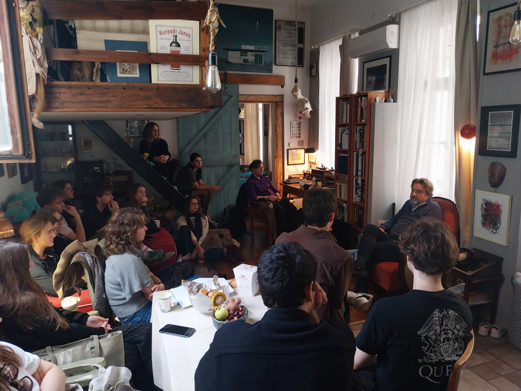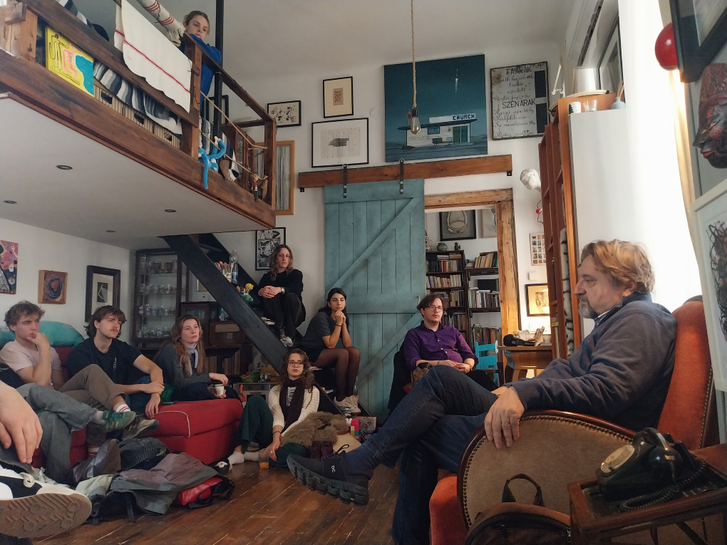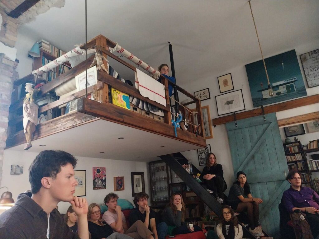 In the framework of the elective course ’Regime Types and Human Rights’, a group of students attended a special class off-campus, in Terézváros, the 6th District of Budapest. The course leader, Eszter Kirs (Department of International Relations), invited them to her home to create an environment where participants could sense the atmosphere of underground, uncensored lectures delivered in private apartments under state socialism.