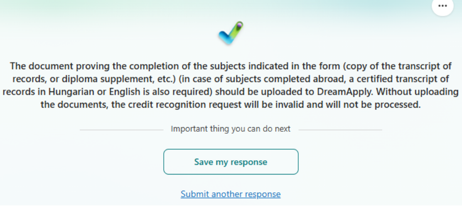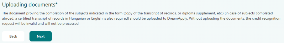 The documents certifying the completion of the subjects indicated in credit recognition request (copy of the transcript of records, or diploma supplement, etc.) (for subjects completed abroad, a certified transcript of records in Hungarian or English is also required) must be uploaded to your DreamApply profile. Without uploading these documents, the submitted credit recognition request will be invalid and will not be considered.