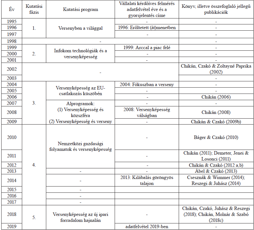 A további részleteket és az egyes fázisok publikációit a Vezetéstudomány jubileumi különszámában megjelent cikkünk tartalmazza. (Chikán, A., Czakó, E., Demeter, K., & Losonci, D. (2019). Versenyben a világgal? A mikrogazdasági versenyképességi kutatások eredményei, 1995-2018, Vezetéstudomány, 50(12), 16-31.)