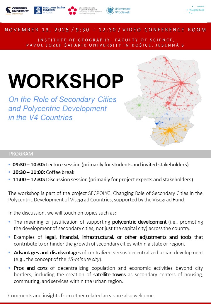 The second interdisciplinary scientific seminar focused on identifying, understanding and expressing the specificities and possibilities of polycentric development in the V4 countries by revealing the regional development role of secondary cities.
