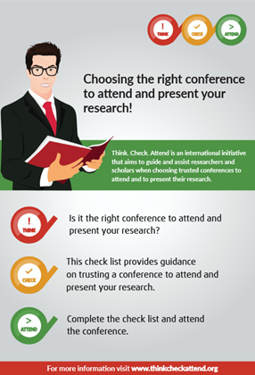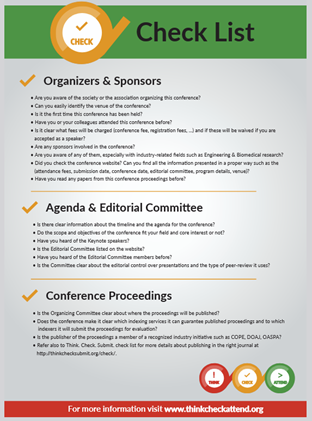 Think. Check. Attend. – célja, hogy útmutatást és segítséget nyújtson az oktatóknak, kutatóknak, hogy megítéljék a konferenciák legitimitását és hitelességét. Ebben a kezdeményezésben számos lépésen és egy ellenőrző listán keresztül segítik a tudósoknak felismerni a megbízható konferenciák jellemzőit, amelyeken részt vehetnek, és beadhatják absztraktjaikat.