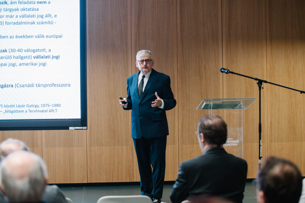 Opening the conference, Prof. János Lukács, Head of Department (Corvinus, Department of Accounting), said: “It is good to come together and remember someone who had been a teacher, colleague, friend and role model. He was marked by deep knowledge, humanity and dignity.” He added that the legacy of the former Department of Economic Law continues within the current institute. Lukács described the event as a family gathering and recalled the highlights of Sárközy’s career, from the Institute for Legal Studies of the Hungarian Academy of Sciences to government service, the presidency of the Hungarian Lawyers’ Association, and even ice hockey. Although Sárközy later taught and established academic units at several universities and served as a rector, he always defined himself as a legal scholar and a lecturer at Corvinus. “His lively teaching style made him one of the most popular lecturers on campus. The students loved his unmistakable style.”, he said.