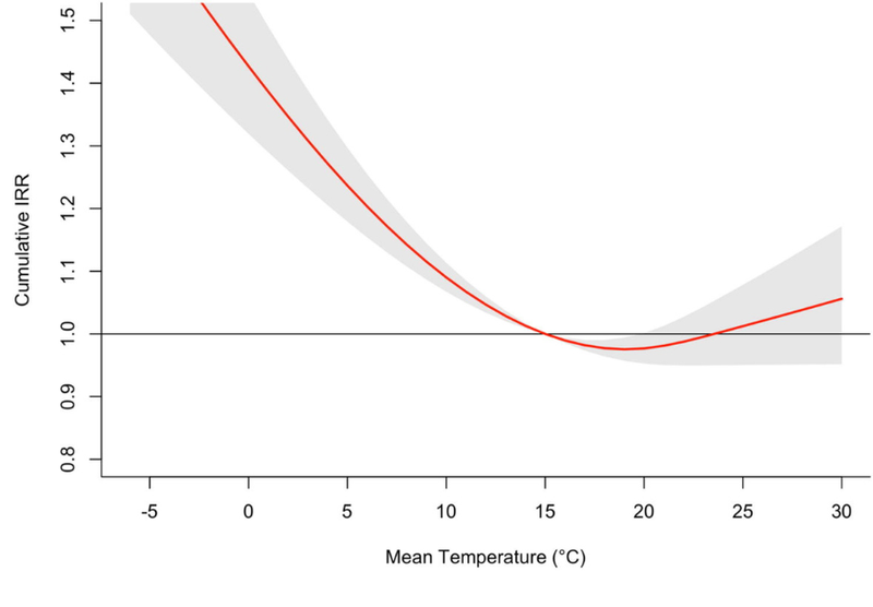 A napi átlaghőmérséklet és a kórházon kívüli szívmegállás kockázata közötti kumulatív összefüggés a napi átlaghőmérséklet függvényében 21 napos késleltetéssel. A piros vonal a becsült kumulatív IRR-t jelzi: azt, hogy szívmegállások előfordulási aránya mennyivel magasabb vagy alacsonyabb egy adott hőmérsékleti helyzetben a legalacsonyabb értékhez képest. A szürke árnyékolás a 95%-os konfidenciaintervallumot jelöli.