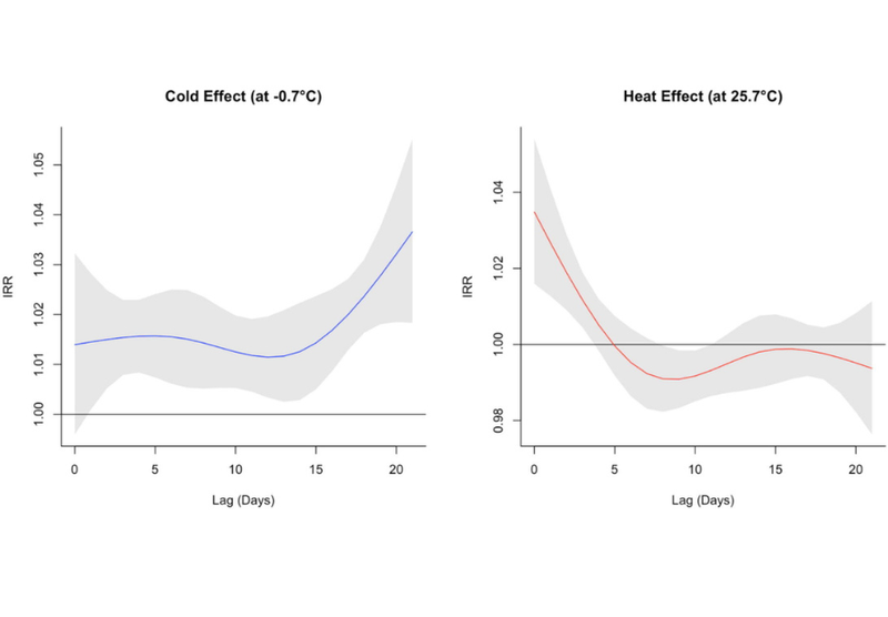 A hideg- és melegexpozíció késleltetett hatása az eltelt napok száma alapján a szívmegállások előfordulására, az IRR-re, amely azt jelzi, hogy a szívmegállások előfordulási aránya mennyivel magasabb vagy alacsonyabb egy adott hőmérsékleti helyzetben a legalacsonyabb értékhez képest. A szürke árnyékolás a 95%-os konfidenciaintervallumot jelöli.