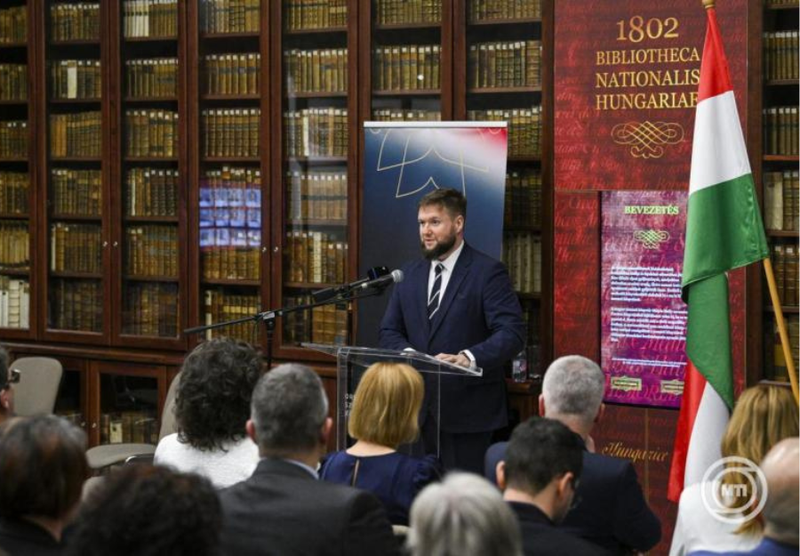Fotó: Vincze Máté közgyűjteményekért és kulturális fejlesztésekért felelős helyettes államtitkár beszédet mond a közművelődési és könyvtári miniszteri elismerések átadóünnepségén, a magyar kultúra napjához kapcsolódó eseményen Budapesten, az Országos Széchényi Könyvtárban 2026. január 20-án. MTI/Purger Tamás