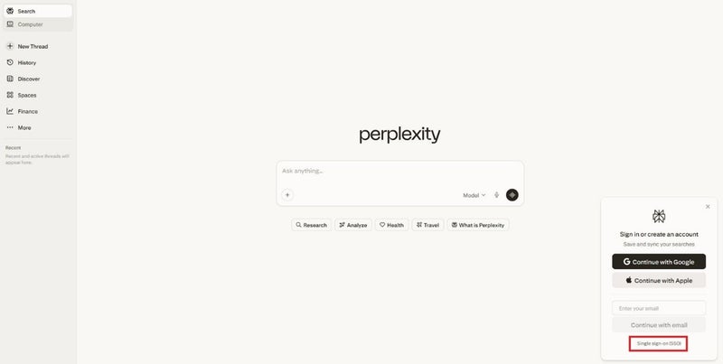 Navigate to the Perplexity website using your web browser (https://www.perplexity.ai/). You will see a panel on the lower right-hand side: “Sign in or create an account”.